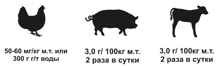 Телята (до 3-х месяцев), ягнята, свиньи: 3,0 г/100 кг массы 2 раза в сутки с водой/кормом или 300–350 г/1000 л воды.