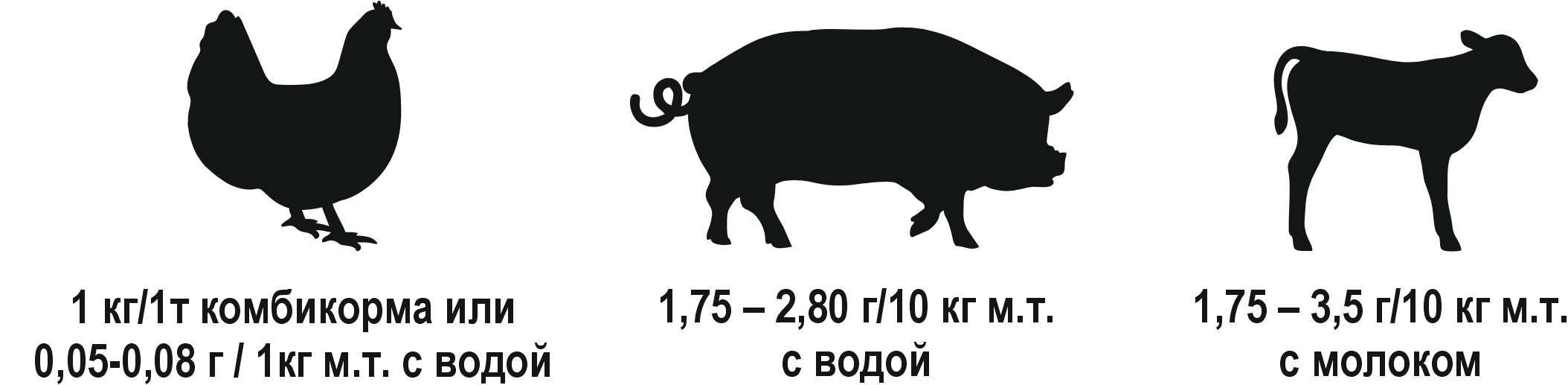 Свиньям 1,75 – 2,80 г препарата на 10,0 кг массы тела животного с водой для поения один раз в сутки в течение 3-5 дней;