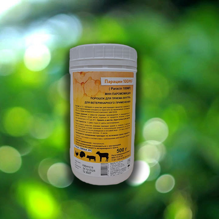 Парацин 100MF — это выбор для тех, кто ценит удобство применения, широкую направленность действия и адаптацию к реальным условиям животноводства. Перед применением необходимо ознакомиться с инструкцией, так как препарат имеет противопоказания и ограничения по использованию.В 1,0 г препарата в качестве действующего вещества содержится 140,0 мг паромомицина сульфата (в пересчете на паромомицин основание 100 мг), а также вспомогательный компонент декстроза.